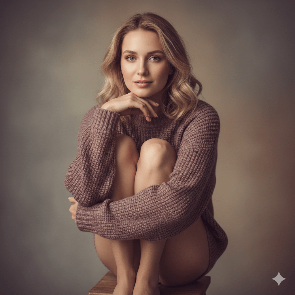 "description": "High-quality, soft, cinematic portrait of an adult Caucasian woman sitting on a wooden stool in a cozy intimate studio. Front-facing three-quarter angle, hugging knees, one hand near chin. Soft directional side lighting, pastel-toned palette, shallow depth of field.",