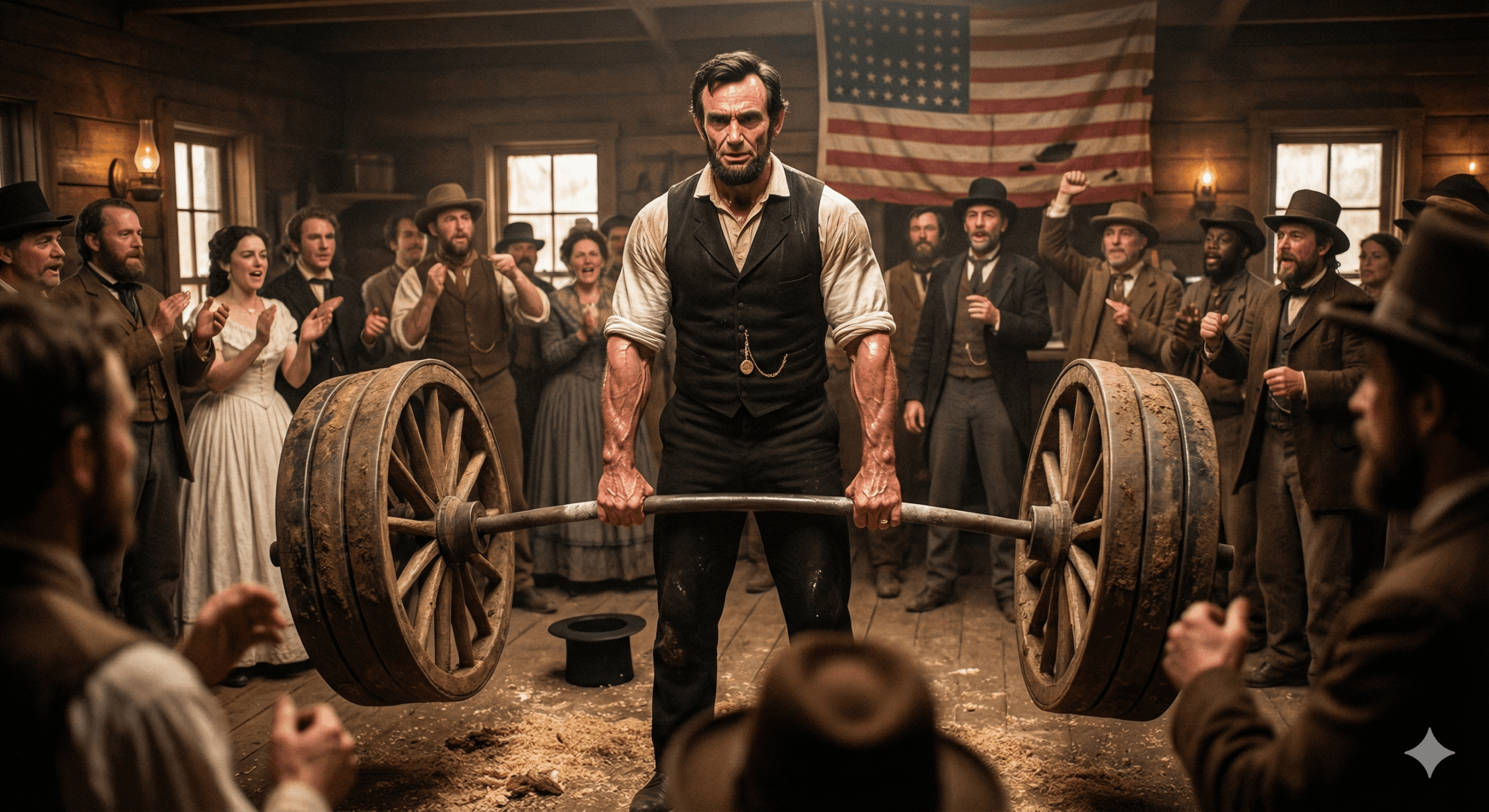 Make the coloring look like it was shot with a Sony a7riii in a sport candid with glistening bodybuilder muscles but keep the Abraham Lincoln swole theme with 3 wagon wheels and sweat sheen and the men and the one beautiful woman in white and the faded torn flag. Giant Abraham Lincoln has gigantic muscles like Arnold Schwarzenegger on steroids and is straining to lift a barbell with three gigantic heavy wagon wheels on each side. The Victorian people gather around him, cheering. He is in a tavern. The forearms are shown by the rolled up white shirt button down with a vest and a gold watch. He has a thick beard. He has the body of a anime God. His classic top hat is throwing on the floor, wooden floor which is messy.