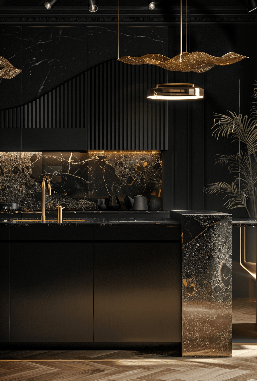 Art Deco kitchen blueprint with a focus on high contrast colors and metallic finishes for visual impactArt Deco kitchen blueprint with a focus on high contrast colors and metallic finishes for visual impact
