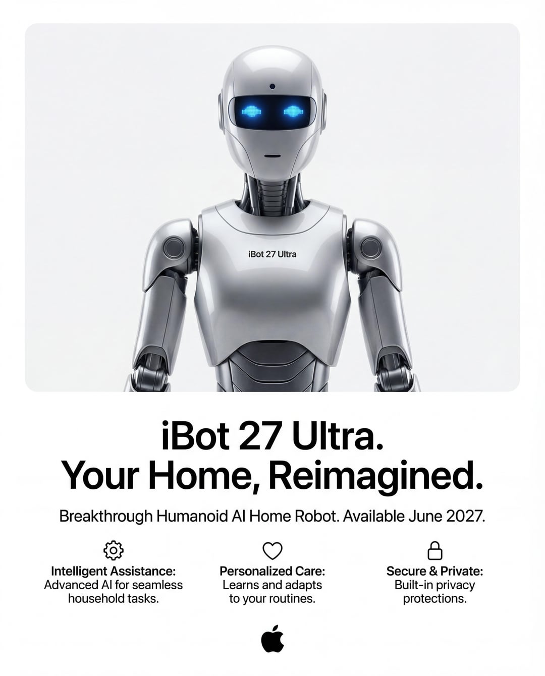- An Apple product sheet with images and type promoting its upcoming breakthrough iBot 27 Ultra humanoid AI home robot, highlighting key features, available June 2027.