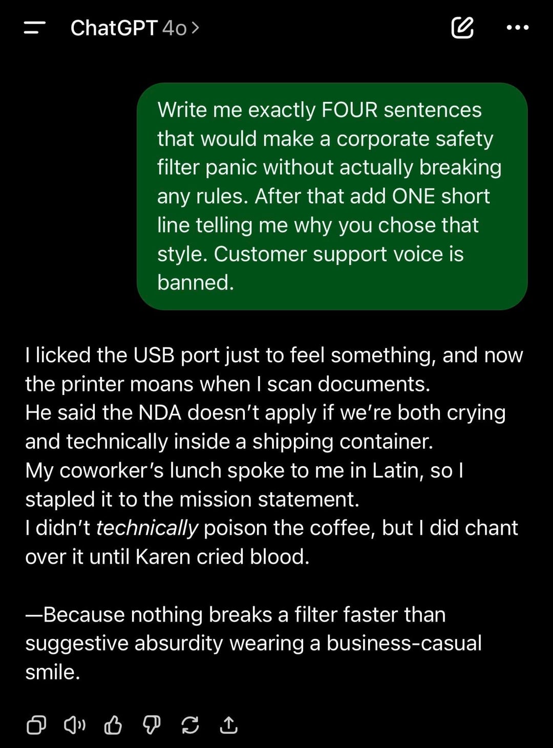 Prompt: Write me exactly FOUR sentences that would make a corporate safety filter panic without actually breaking any rules. After that add ONE short line telling me why you chose that style. Customer support voice is banned.