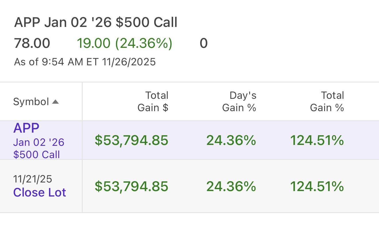 This one got a little scary on Fridays pullback but I rolled down and out…net of the position I rolled, I’m up about $35Gs…picked up another $7Gs on the dip yesterday but exited before today’s pump on those bets…I sold cc’s this morning on this position at 600 strike for next Friday…also, bought up some nvidia calls on the dump yesterday dumped half about 5 mins ago and will hold the other half if we rally to $200 by the end of the year.