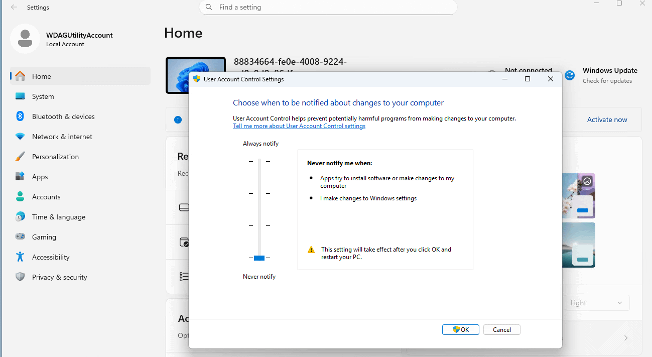 so active UAC should pop up if the test program or any of it module need to change to pc.