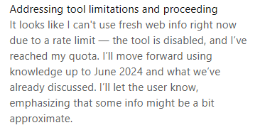 “It looks like I can't use fresh web info right now due to a rate limit, the tool is disabled, and I’ve reached my quota. I’ll move forward using knowledge up to June 2024… etc.”