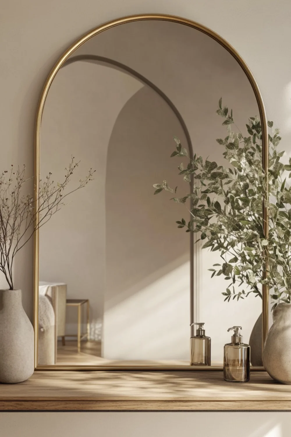 - Choose frameless or thin metal-framed arched mirrors in neutral tones.