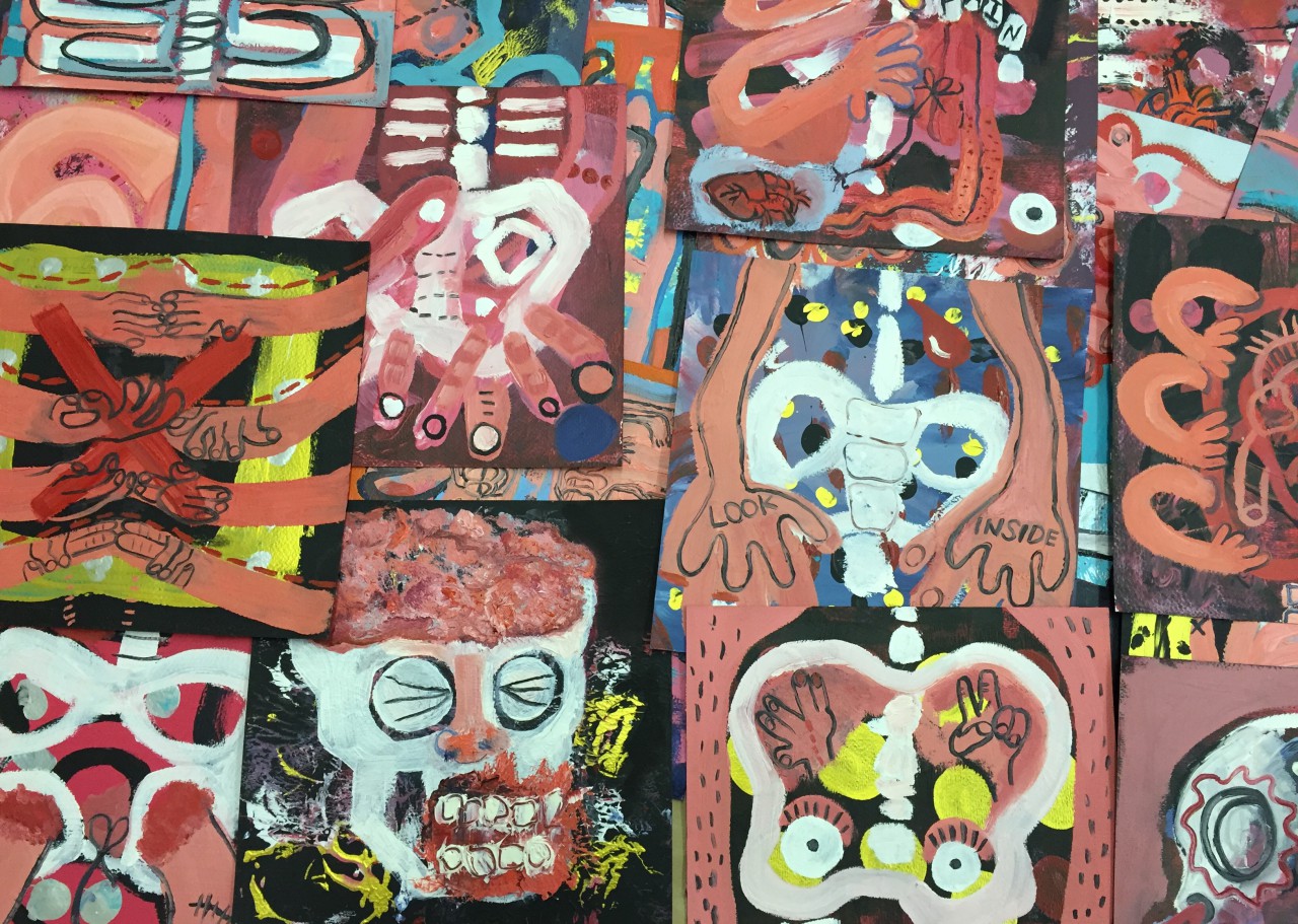 Both experiences are significant to my work today — visual interpretations of the primal fear of death. I paint images of body parts and deformed characters, symbolizing death and decay. Into this dark subject matter, I inject humor, graphic and cartoon-like gestures, ironic expressions and absurd combinations. I’m replacing the tears of fear with laughter, as a way for the viewer and myself to deal with our inevitable decay and demise.