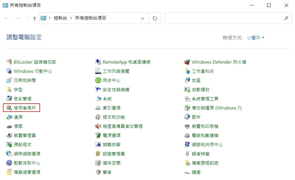 Step 1. 打開控制台,選取使用者帳戶