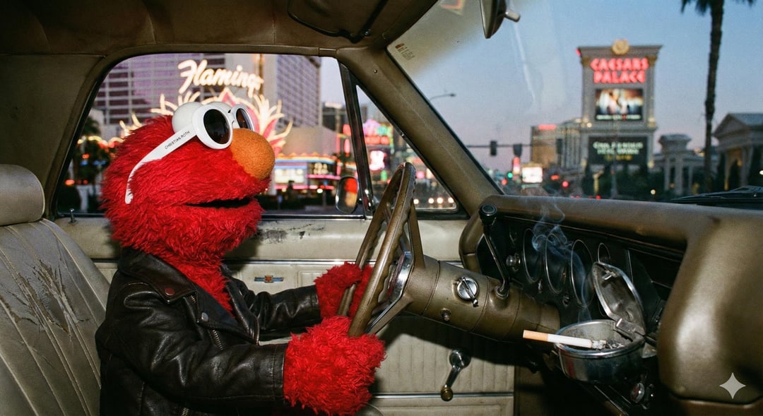 {"prompt": "a candid photograph of Elmo, the red Muppet, wearing white Christian Roth clout goggles and a leather jacket, driving a vintage Chevy El Camino down the Las Vegas Strip at dusk. Neon signs for 'Flamingo' and 'Caesars Palace' blur in the background. A lit cigarette smolders in the car's dashboard ash tray, with smoke curling up."}