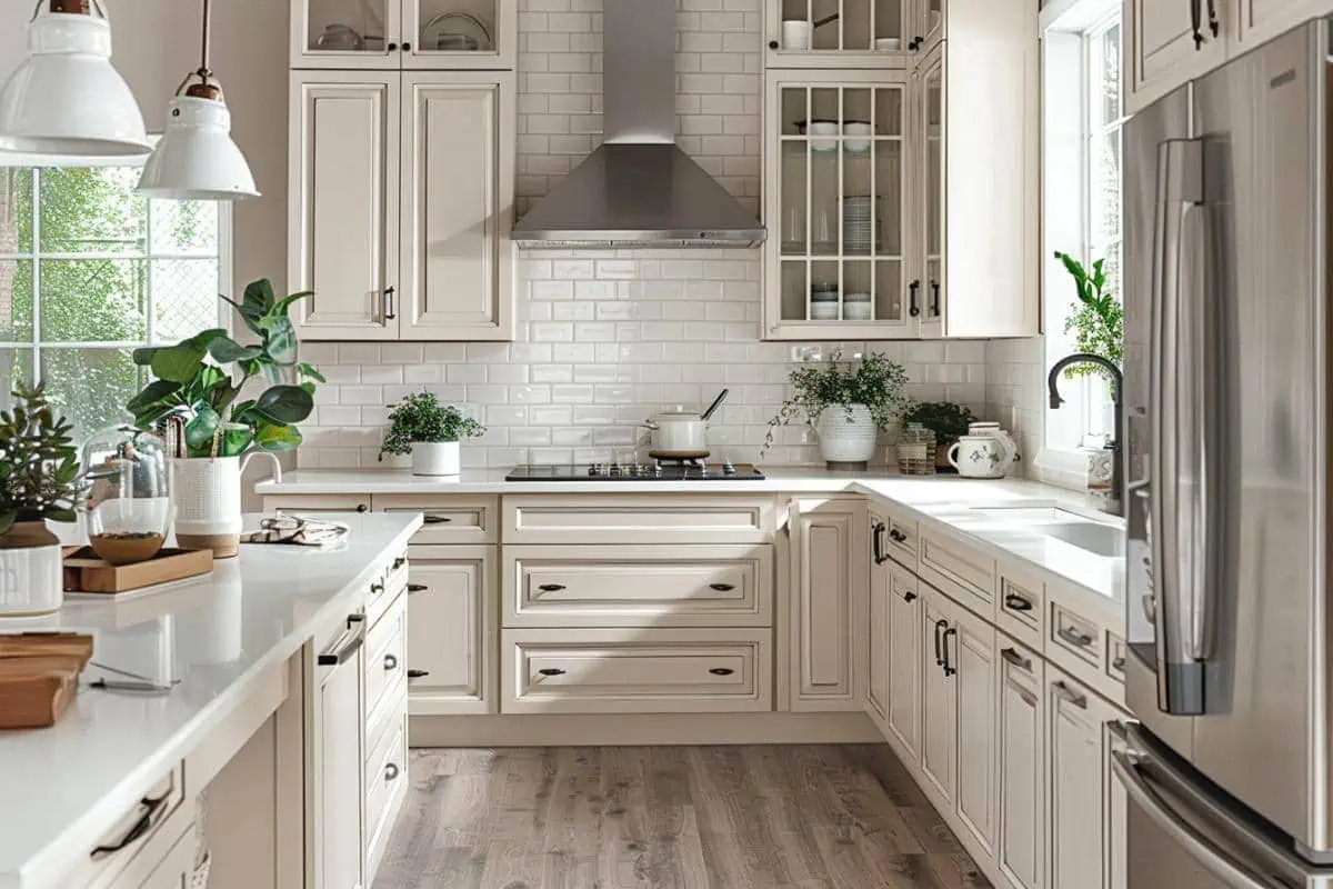 Bright kitchen interior with beige shaker cabinets, subway tile backsplash, and stainless steel appliances, complemented by potted green plants and white pendant lighting.Bright kitchen interior with beige shaker cabinets, subway tile backsplash, and stainless steel appliances, complemented by potted green plants and white pendant lighting.
