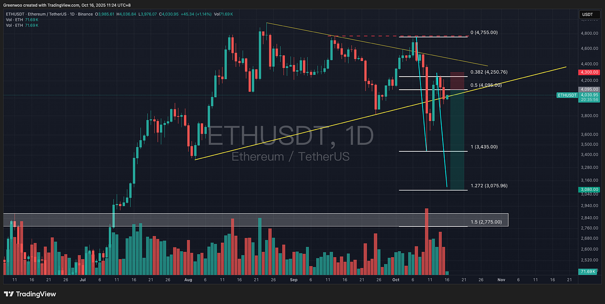 As of writing, it is temporarily reported at $4,030. Investors can choose to enter a short position at market price or set up a short order near $4,095 (the latter being Fibonacci 0.5). Take-profit targets can be set in batches at $3,435 / $3,080 / $2,800. Stop-loss can be set above $4,300.