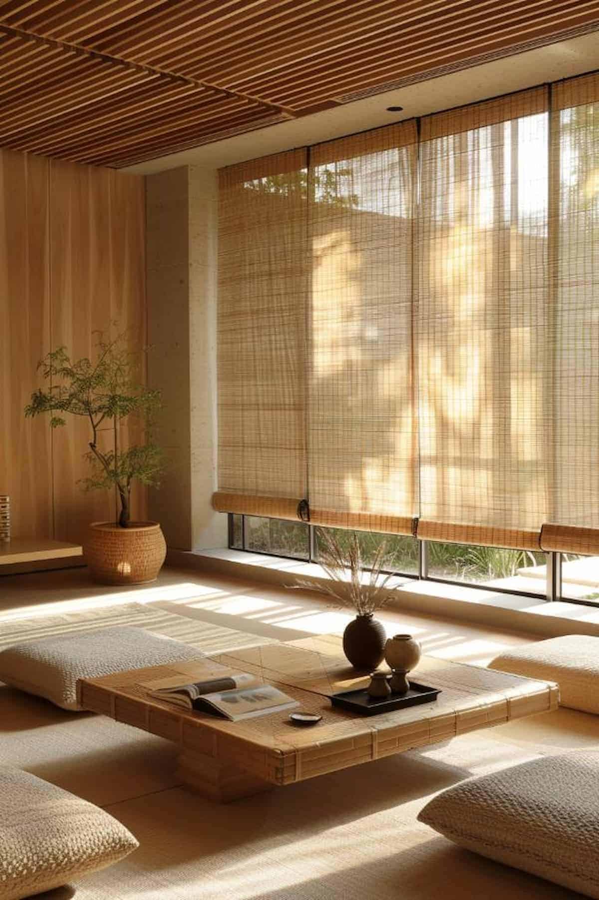 Bamboo features heavily in Japandi-style interiors. This space makes the most of it with a slatted bamboo ceiling and bamboo blinds that filter sunlight, casting gentle shadows across the room.