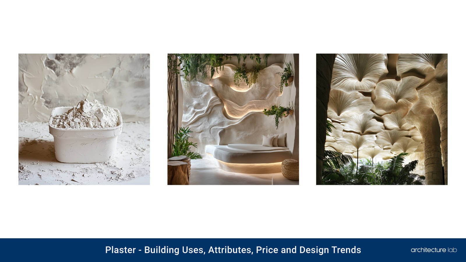 Plaster is a building material used to coat walls and ceilings or make decorative elements. The material can improve the appearance and durability of a surface and provide a smooth and clean base for painting. It can also be cast into different shapes and forms, such as statues, moldings, and ornaments. There are many types of plaster, each with different uses and attributes. Some common types are cement plaster, clay plaster, gypsum plaster, lime plaster, and plaster of Paris. These types vary in mixing methods, application techniques, setting times, and finishes. Some types are more suitable for interior walls, while others are more suitable for exterior walls. The price of plaster can vary depending on factors such as location and quantity required. In the United States, plaster costs range from $10 (€9.1, £8.7) to $30 (€27.3, £26.1) per bag, while in Europe, the cost typically ranges from $9.81 (9€, £7.83) to $25.07 (23€, £20.01) per bag. Plaster also requires skilled labor and proper tools to apply and maintain. The design trends of plaster also change over time, depending on the preferences and needs of the customers. It can be used to create various styles, such as modern, rustic, classic, or artistic.