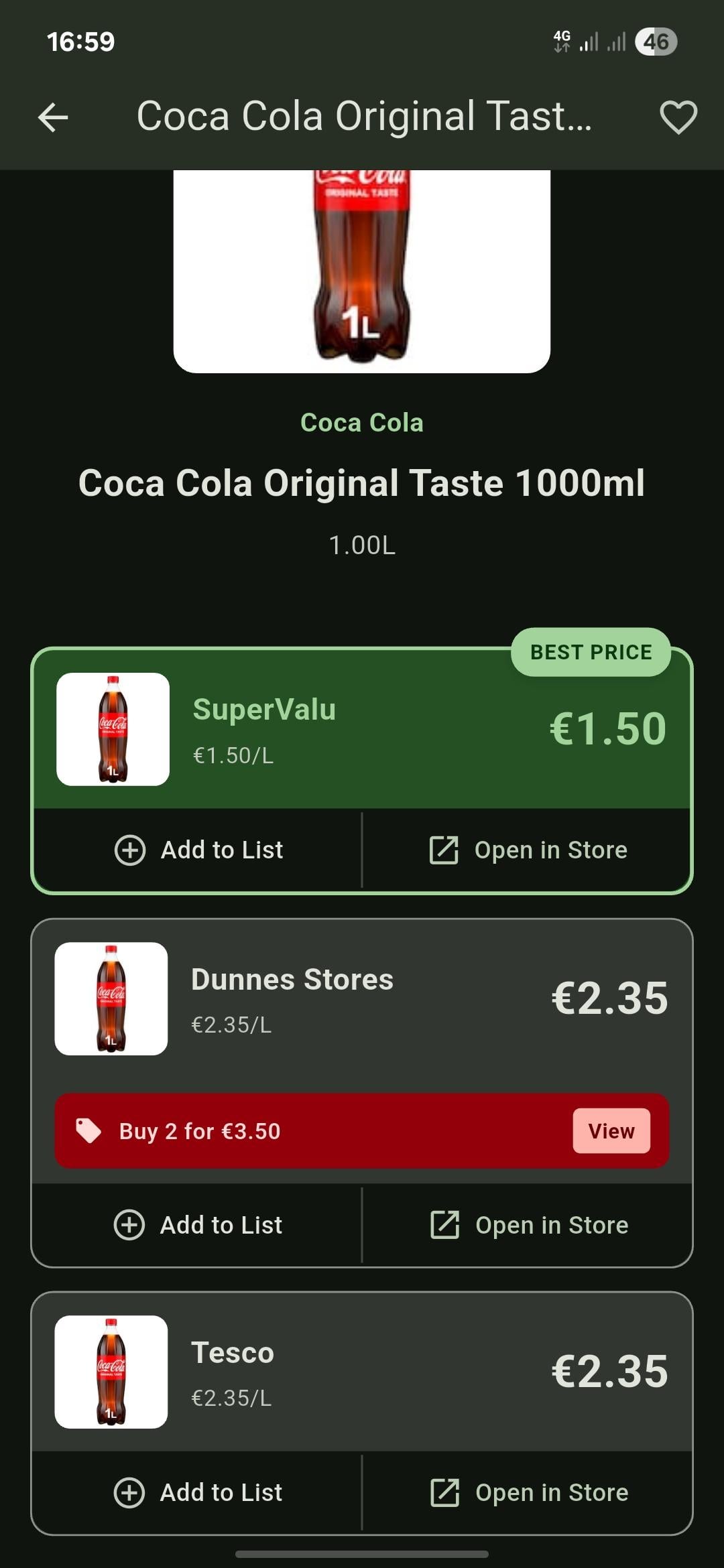 So instead I built a shopping list with price comparison. You can search for a product and see the prices from Tesco, Dunnes, Lidl, Aldi, SuperValu and Centra. Lidl, Centra is current deals only.