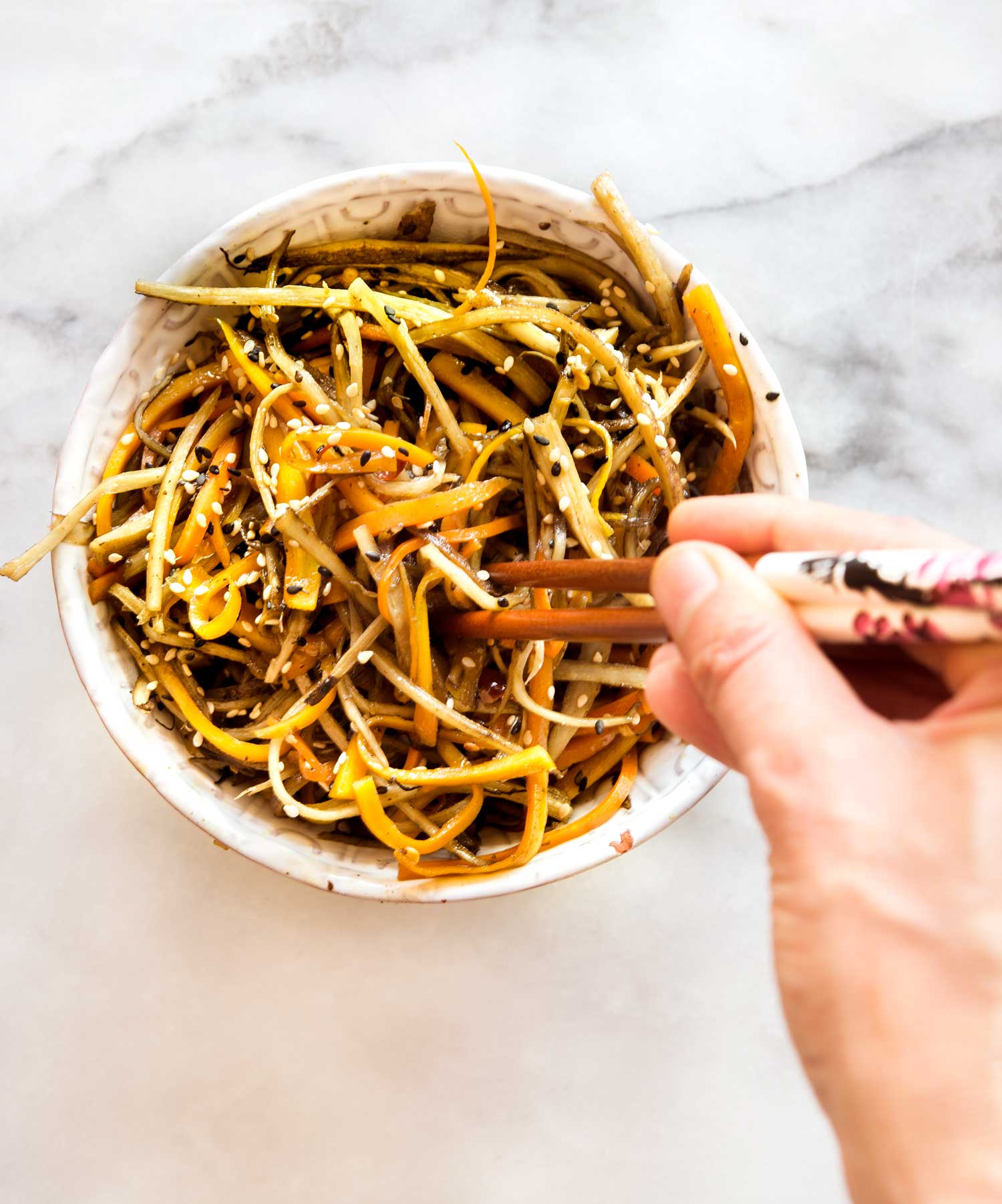 This is a simple little salad that I was turned on to a few weeks ago at a Japanese restaurant in Brooklyn, NY. By looks alone, it — kinpira gobo (braised burdock root) — might not seem all that impressive. However, there’s more to this salad than meets the eye. Let your taste buds be the judge. This salad has a lot going on flavor-wise (salty, sweet) and texture-wise (slightly crunchy).