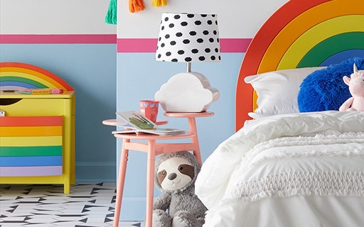 Motivada a criar espaços alegres para seus filhos, a atriz americana Drew Barrymore desenvolveu sua própria linha de mobiliário que faz qualquer criança sonhar acordada. Batizada de Drew Barrymore Flower Kids, a coleção inclui, entre outras peças, essa linda cabeceira em forma de arco-íris que, junto de objetos decorativos, quadrinhos e prateleiras, colore o ambiente de forma encantadora.