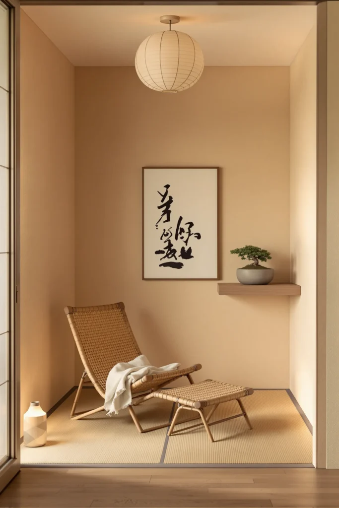 A thoughtfully placed ink brush painting serves as more than just wall decor in this Japandi reading nook, creating a natural focal point that draws your eye while setting a peaceful mood for reading or relaxing. The simple flowing lines and gentle movement in the artwork provide a sense of calm that can help quiet a busy mind after a long day.