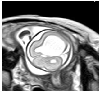 Figura 3. Corte axial en resonancia magnética fetal a las 25 semanas de gestación. Este corte a nivel craneano permite observar la dilatación de ventrículo lateral derecho y la presencia de hipertelorismo. |