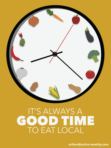In the northeastern United States, there is a common misconception that local food can only be eaten in late summer/early fall. When we picture “local food,” we think fresh tomatoes, greens, potatoes, etc. Once the cold weather arrives, we assume that it’s the end of local eating until next summer. The essence of this poster is that eating local shouldn’t be limited to a specific time of year. When one has the means to eat locally produced food, one should attempt to do so. However, I live in Burlington, Vermont so I understand that the resources I have access to here are far different than those elsewhere in the world. There is a year-round farmers market and a co-op downtown that provide local food. Additionally, Burlington sits in Chittenden County, which is the wealthiest county in the state of Vermont. I also understand, especially as a college student, that local food can cost more. All that being said, when able, local food is worthy purchase. Put ya dollars in the pockets of nearby farmers! |