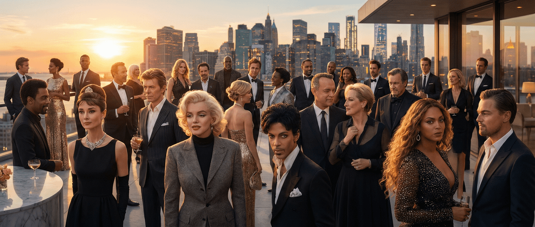Prompt 1: Create a hyper-realistic, ultra-sharp, full-color large-format image featuring a massive group of celebrities from different eras, all standing together in a single wide cinematic frame. The image must look like a perfectly photographed editorial cover with impeccable lighting, lifelike skin texture, micro-details of hair, pores, reflections, and fabric fibers. GENERAL STYLE & MOOD: Photorealistic, 8k, shallow depth of field, soft natural fill light + strong golden rim light. High dynamic range, calibrated color grading. Skin tones perfectly accurate. Crisp fabric detail with individual threads visible. Balanced composition, slightly wide-angle lens (35mm), center-weighted. All celebrities interacting naturally, smiling, posing, or conversing. Minimal background noise, but with enough world-building to feel real. THE ENVIRONMENT: A luxurious open-air rooftop terrace at sunset overlooking a modern city skyline. Elements include: Warm golden light wrapping around silhouettes. Polished marble.