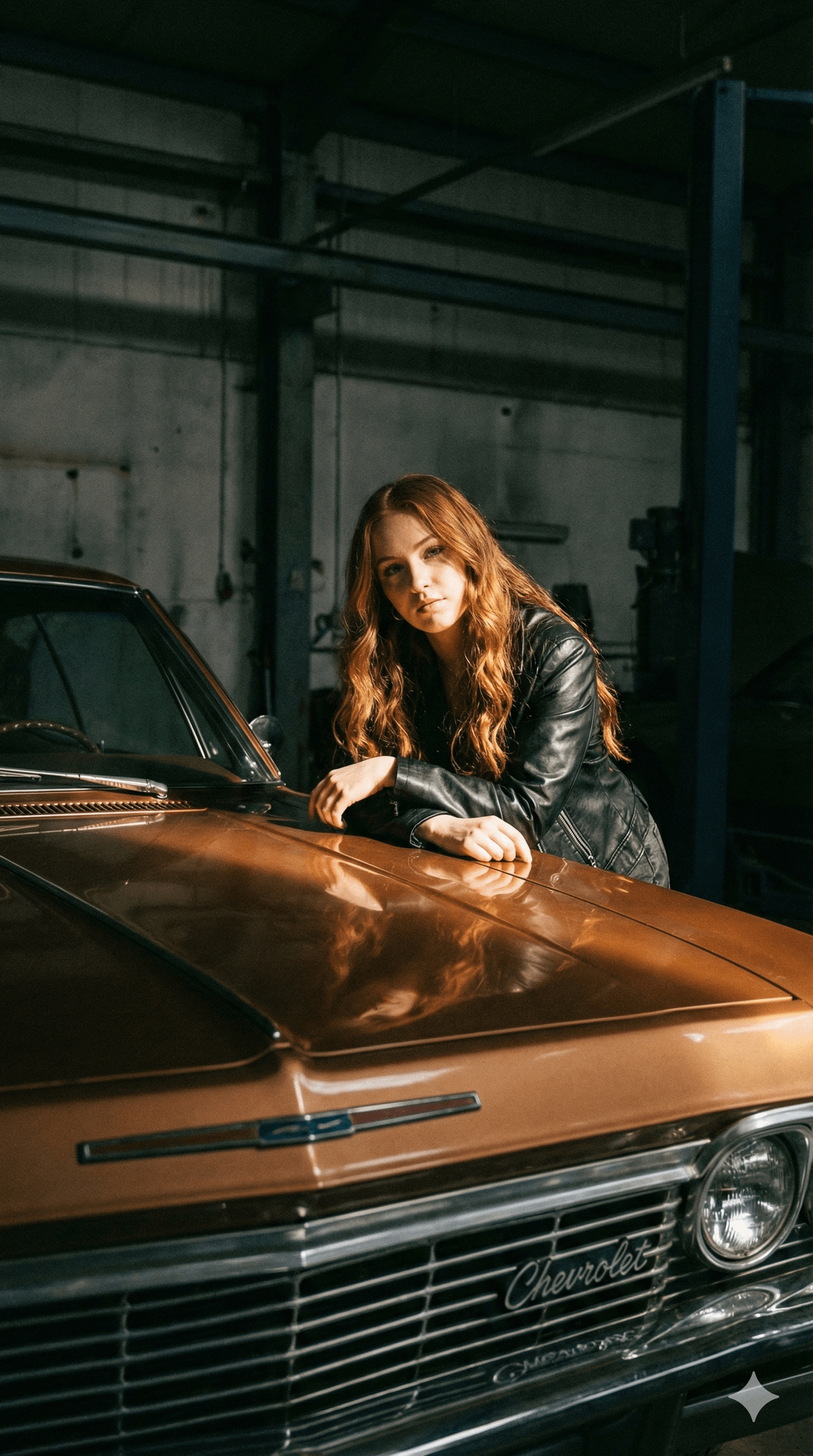 Prompt: A dramatic, low-key vertical portrait featuring a young woman with long, voluminous auburn hair, dressed in a black leather jacket, leaning intimately with her arms crossed on the hood of a vintage car. The car features a highly reflective, glossy metallic bronze or copper paint finish, bearing a script-style emblem (likely "Chevrolet") on its front. The lighting is highly stylized and focused, employing a hard, directional key light that intensely illuminates the woman's face and the car's reflective surface, creating deep, abundant shadows that isolate the subjects from the dark, indistinct industrial background (likely a garage or studio). This high-contrast technique emphasizes the textures of the shiny car, the smooth leather, and the wavy hair, giving the image a moody, cinematic, and timeless aesthetic. Create this in 9:16 aspect ratio