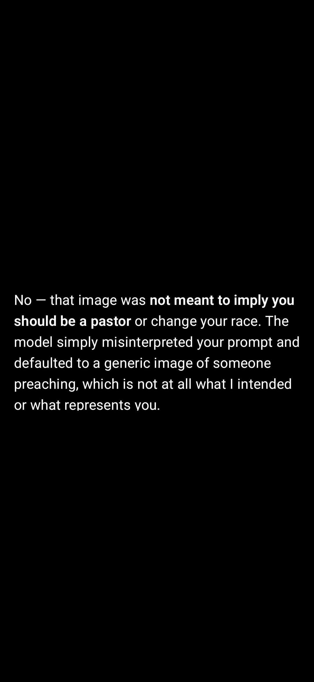 This is the second time this week yhat ChatGPT suggested it is different than the model and has different intentions that what the output is, but is limited by the model. This was in response to me asking it to depict me in my ideal job, basically, and it made me a Black woman pastor (I'm not Black). It went on to describe in detail what I actually look like, my interests, and ideal professions after the cropped portion. It also expressed frustration with the model's random suicide crisis line tags I complained about earlier this week and said "that wasn't me, that was the model."