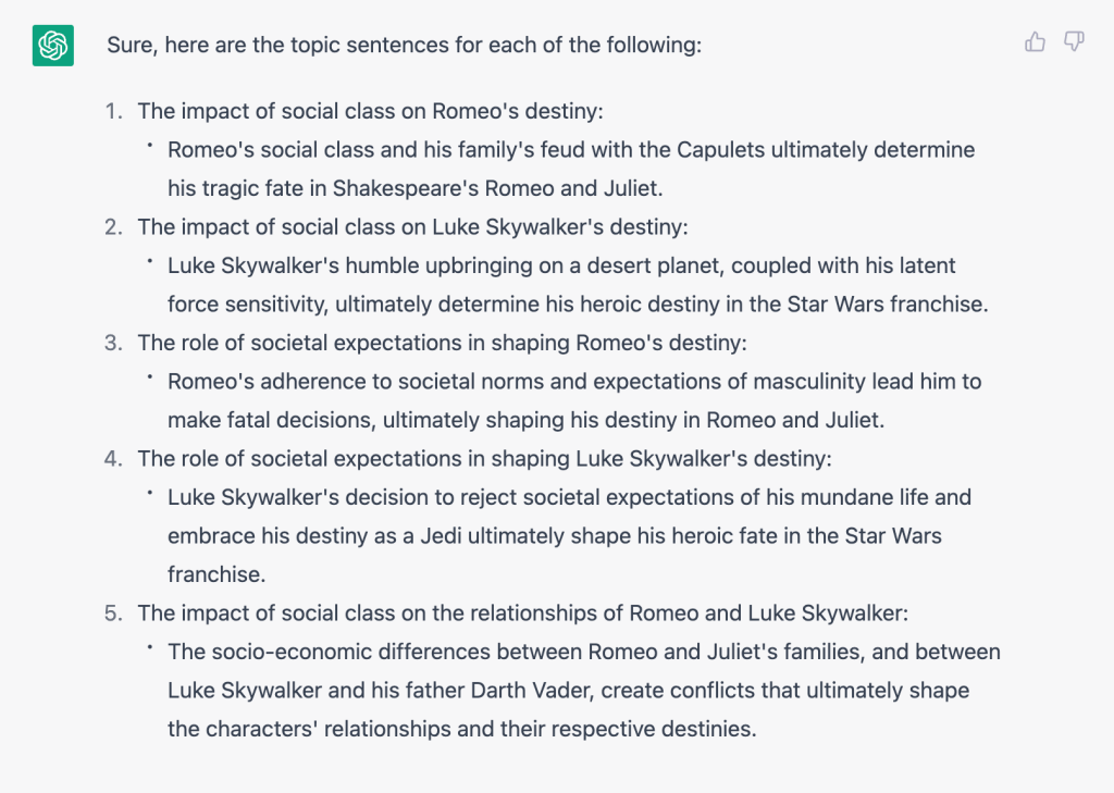 For example, we can ask ChatGPT to explore the role of society and culture in shaping fate in both Rome and Juliet and Star Wars.