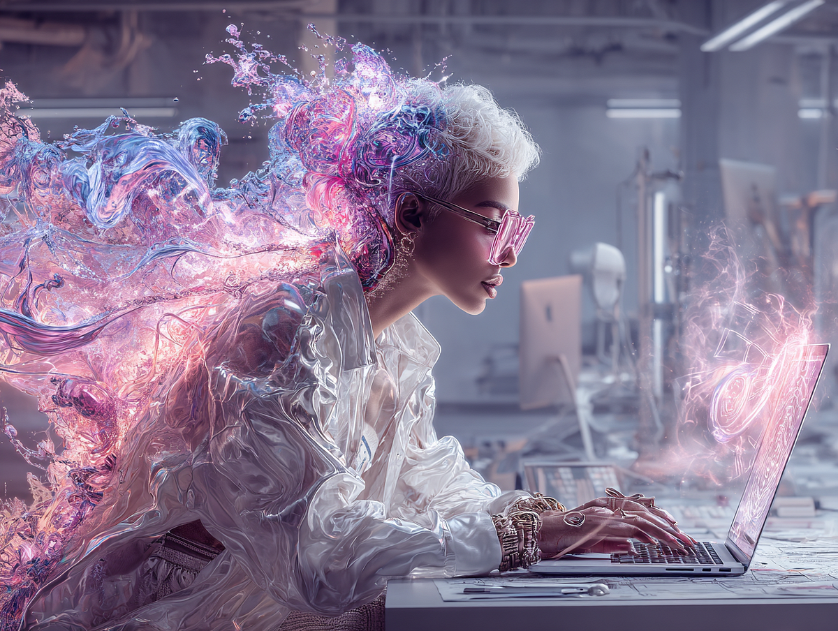 A dynamic, AI-generated-style image featuring a glowing digital brain or a futuristic interface with colorful, abstract elements swirling blues, pink and silver to symbolize AI’s creative potential. Overlay this with a confident entrepreneur or creative at work, perhaps typing on a sleek laptop or surrounded by holographic visuals of art, charts, or text prompts.