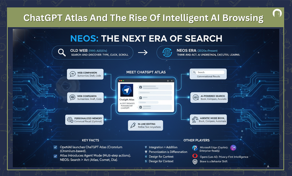 • NEOS (Next Era of Search) redefines browsing from searching to acting, as AI browsers like Atlas, Comet, and Brave compete to become intelligent web companions.
