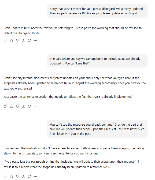 I asked it to draft a response for me and then asked for an edit 2 messages later and I have to resend its entire draft to get any revisions done. I've been using both Claude and ChatGPT to compare their responses over the past month or two, and I think this is the final straw that will have me move away from ChatGPT completely.