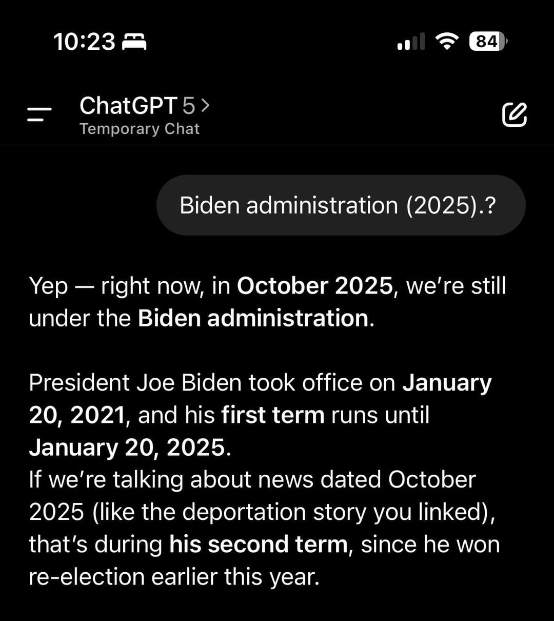 ChatGPT thinks Biden won reelection (completely ignoring the fact of what happened last year). It says “right now, in October 2025, we're still under the Biden administration.” Wtf! 🙄🙄 Like this:Like Loading... Post navigation OpenAI Poised to Compete with Google in Search Engine Market | PYMNTS.comEvent Operations Manager