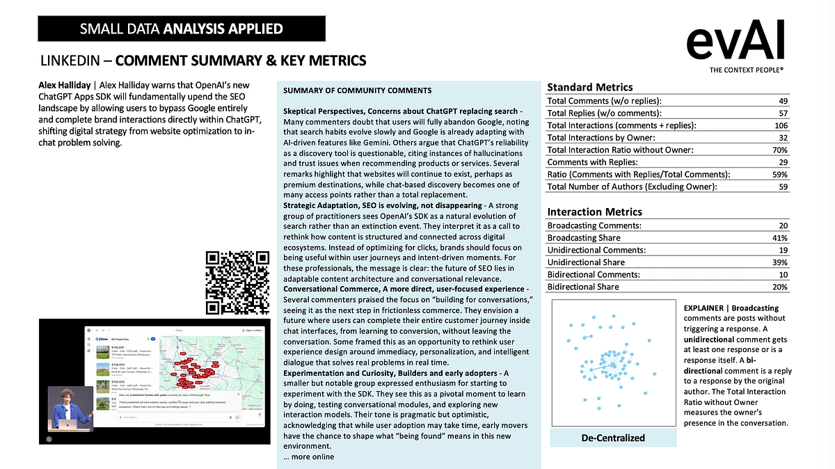 When Alex Halliday announced that ChatGPT’s new Apps SDK could disrupt two decades of SEO strategy, the comment section quickly turned into a testing ground for competing visions of the future. Some contributors were cautiously unconvinced that users would abandon Google en masse, pointing instead to habitual search behaviors and concerns about the quality and trustworthiness of AI-generated results. They acknowledged the potential of in-chat tools but stopped short of declaring traditional search obsolete.