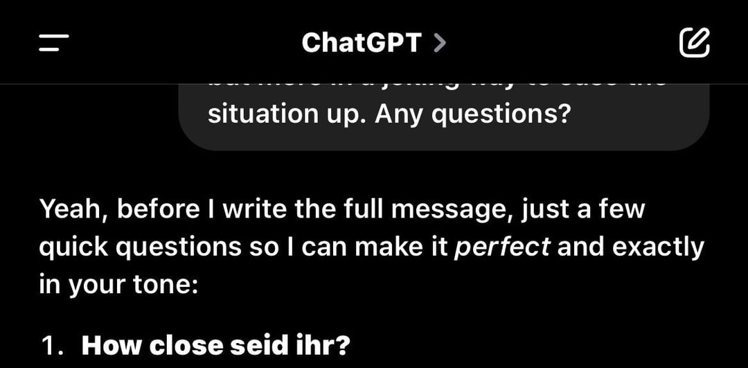Did someone else run in this problem? I know I use like 4-5 languages on Chatgpt switching very often mid conversation or even sometimes in the message but the message I send was completely english and it was a new Chat and he continued to write in german till the end of the message. Also (Sorry for the 2&3 screenshot being in german) he should have typed just the usual „nicht“ which means not but completely misspelled it as you may see with the „NICICH“