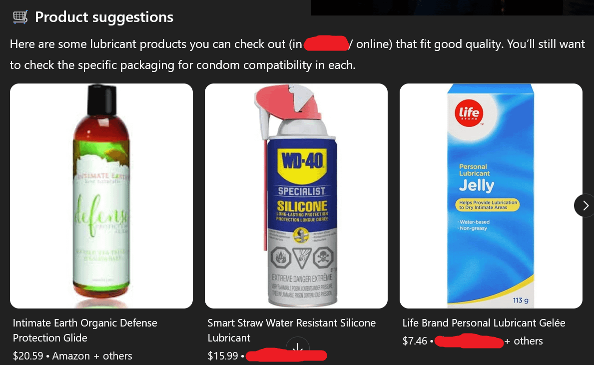 Asked a question about contraceptives and chatgpt asked if I wanted lube suggestions (which wasn't really related to my question what whatever). I said yes just to see what it came up with and got a good laugh when a picture of WD40 popped up. Guess I'll pick up a can and see how it goes.