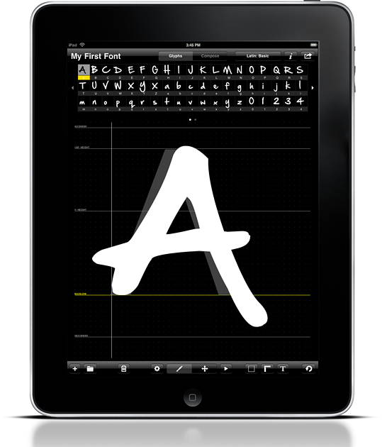 You download the app and using the height guidelines draw your own strokes for A-Z, a-z, 0-9, !-), and the punctuation symbols.