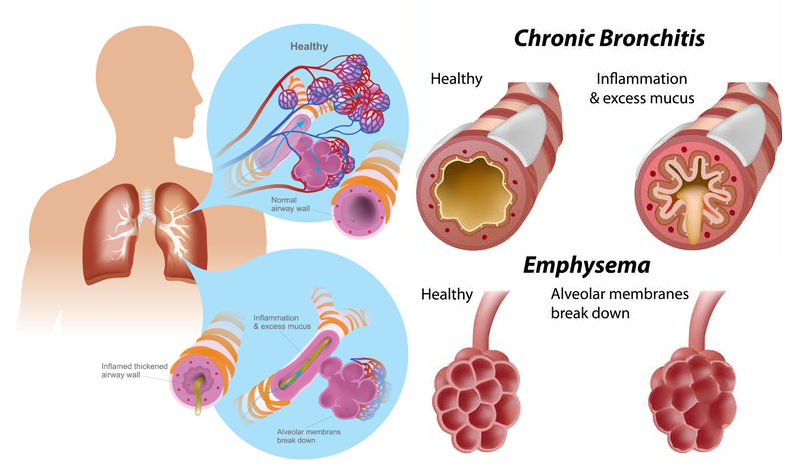 Emphysema and chronic bronchitis are the two most common conditions that contribute to COPD. These two conditions usually occur together and can vary in severity among individuals with COPD. Chronic bronchitis is inflammation of the lining of the bronchial tubes, which carry air to and from the air sacs (alveoli) of the lungs. It’s characterized by daily cough and mucus (sputum) production. Emphysema is a condition in which the alveoli at the end of the smallest air passages (bronchioles) of the lungs are destroyed as a result of damaging exposure to cigarette smoke and other irritating gases and particulate matter.