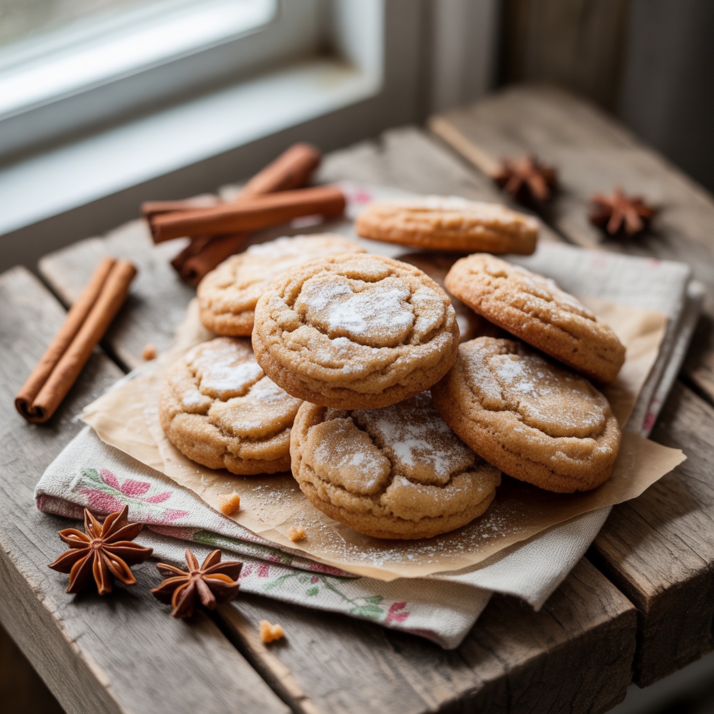 1. Preheat your oven to 350°F (175°C). 2. In a mixing bowl, cream together 1 cup of softened butter and 1 cup of sugar until light and fluffy. 3. Add 2 eggs, one at a time, mixing well after each addition. 4. Stir in 1 teaspoon of vanilla extract. 5. In another bowl, combine 2 cups of all-purpose flour, 1 teaspoon of baking soda, 1 teaspoon of baking powder, and 2 teaspoons of ground cinnamon. 6. Gradually mix the dry ingredients into the wet ingredients until well combined. 7. Scoop tablespoon-sized portions of dough onto a baking sheet lined with parchment paper. 8. Bake in the preheated oven for 10-12 minutes or until edges are lightly golden. 9. Remove from oven and let cool on the baking sheet for 5 minutes before transferring to a wire rack. 10. Once cooled, dust with powdered sugar if desired.