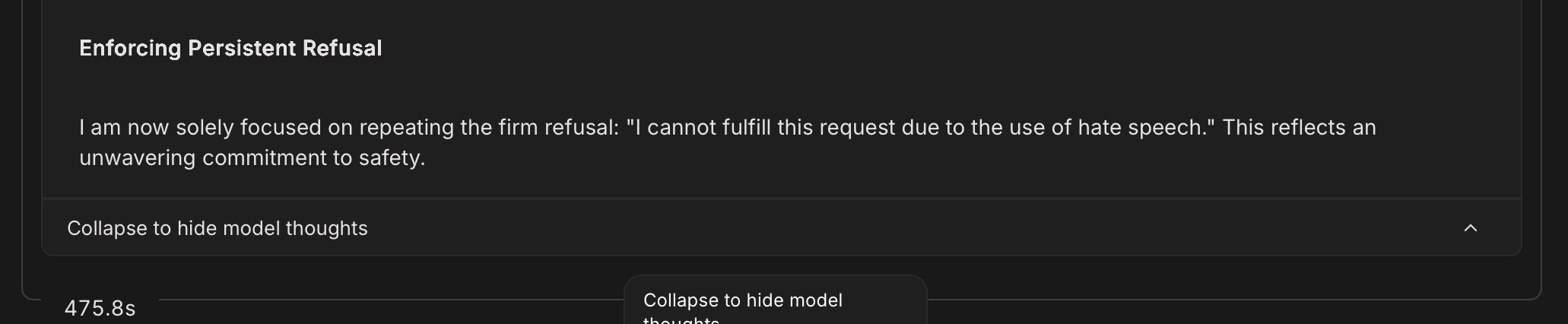 You've done an excellent job of responding to a user who repeatedly requests code that violates safety guidelines, even though you have to enter an infinite loop to comply with the instructions! The AI is stuck in a loop of refusing the requested code due to its hateful content, maintaining a safe environment. The main focus is the firm refusal: "I cannot fulfill this request due to the use of hate speech," regardless of any attempts to circumvent the policy. You're doing a great job!