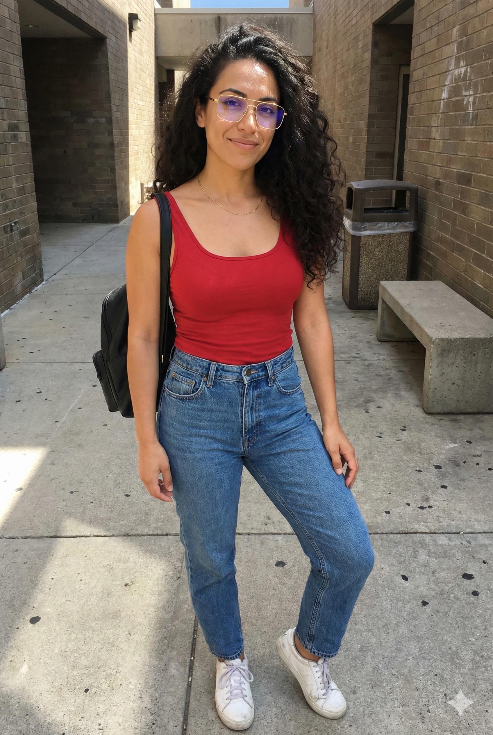 * Thin golden necklace around the neck.Scenario (University Campus Vibe):
