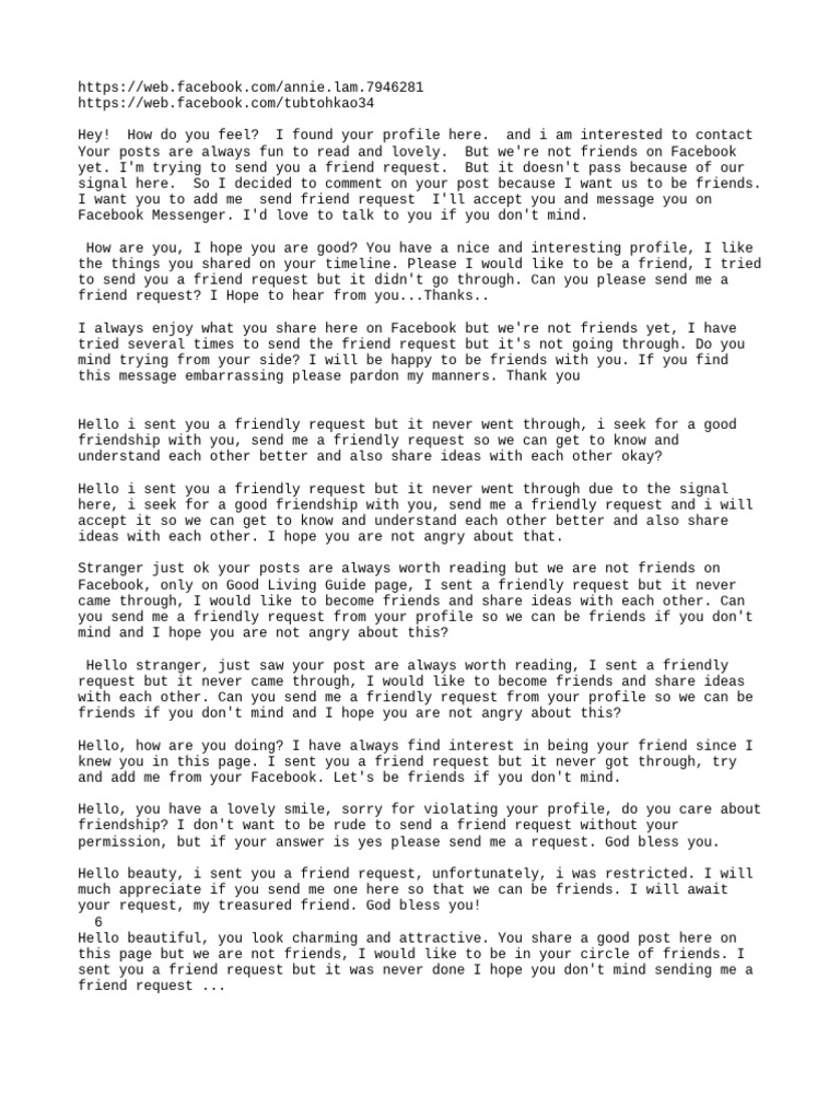 Several messages from different accounts request that the recipient send a friend request on Facebook, saying that their previous requests did not go through due to signal or restrictions. T…