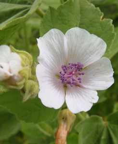 Description: An upright perennial growing to 4 feet tall, has oval to heart-shaped, usually lobed and toothed velvety leaves. Lavender to pinkish-white flowers (July – October) are large, with five petals.