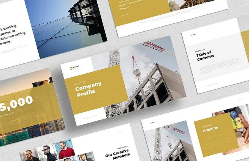 If you need to make a company profile presentation for a construction company, this template is perfect for you. The template contains many very useful pages, such as portfolios, projects, members, testimonials, and so on. In addition to being applied to a company profile presentation of a construction company, the template is also suitable for making various company profiles or other types of presentations, like a business report, pitch deck, etc.