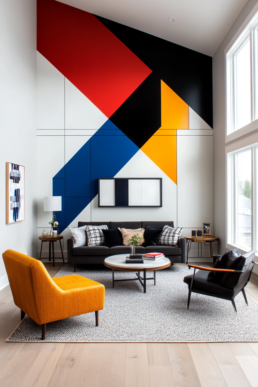 Why it works: Bold geometric shapes immediately catch the eye, adding dynamic energy and contrast. The vibrant colors infuse a playful, modern vibe that enlivens the entire living space.