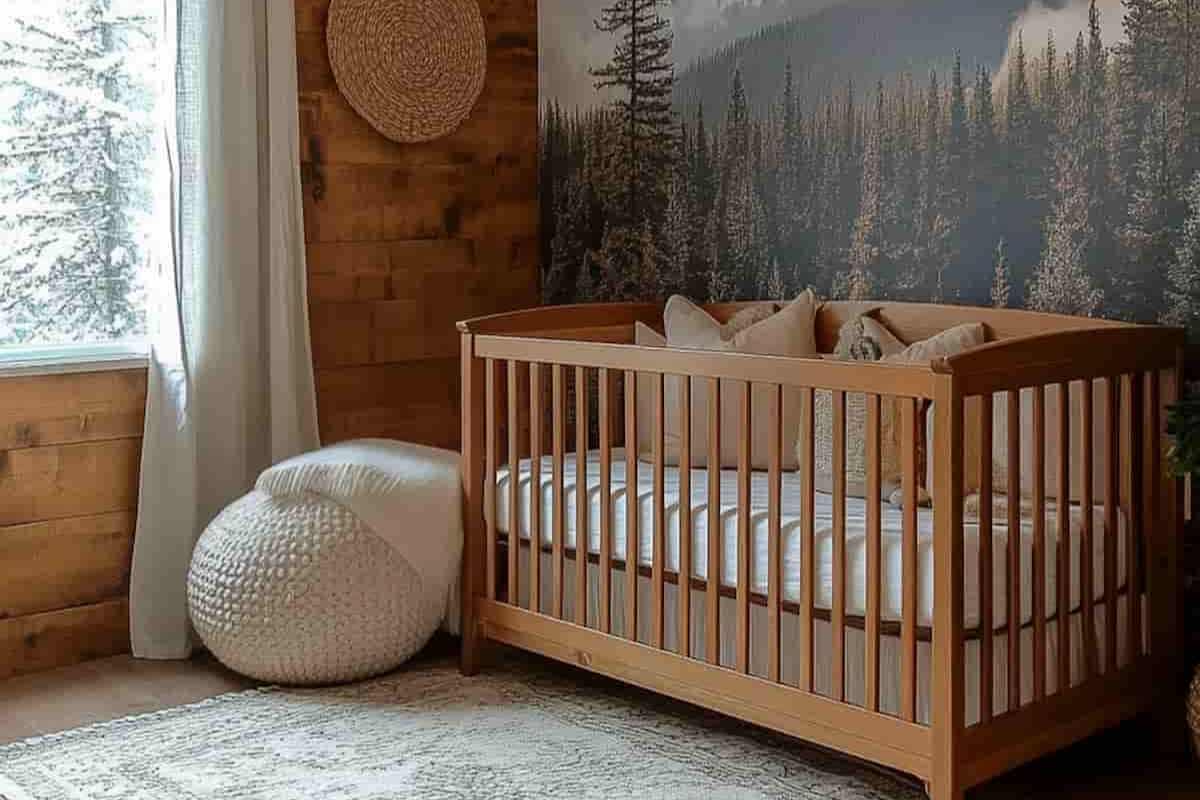 The majesty of mountains is brought home with a mural that frames the nursery in scenic splendor. It features towering peaks and lush forests that serve as a stunning focal point, along with a classic wooden crib.