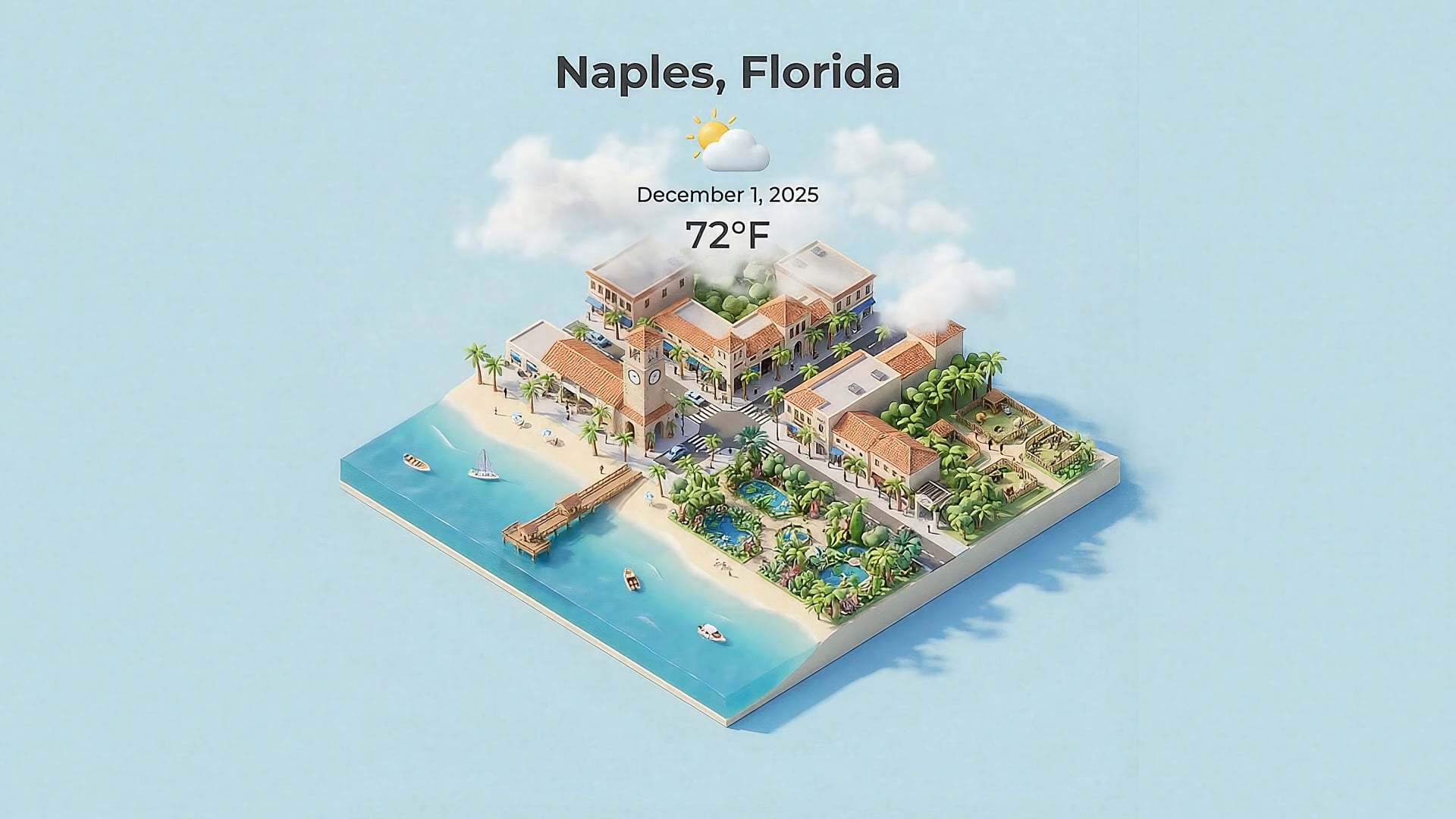 High-fidelity 45-degree isometric animation of a miniature Naples city block, featuring completely empty streets with no vehicles to ensure perfect geometric stability. The ocean water features realistic, gentle fluid simulation that is strictly hard-clipped to the square perimeter, ensuring absolutely no water spills onto the solid background. Green palm trees sway softly in a synchronized breeze, and clouds drift slowly behind the text. The existing title text "Naples, Florida" and weather icon at the top must remain perfectly static and sharp, effectively locked in place. Do not generate any new UI elements, pop-ups, lower-thirds, or floating widgets anywhere in the frame. The buildings and streets remain rigid and non-deforming.
