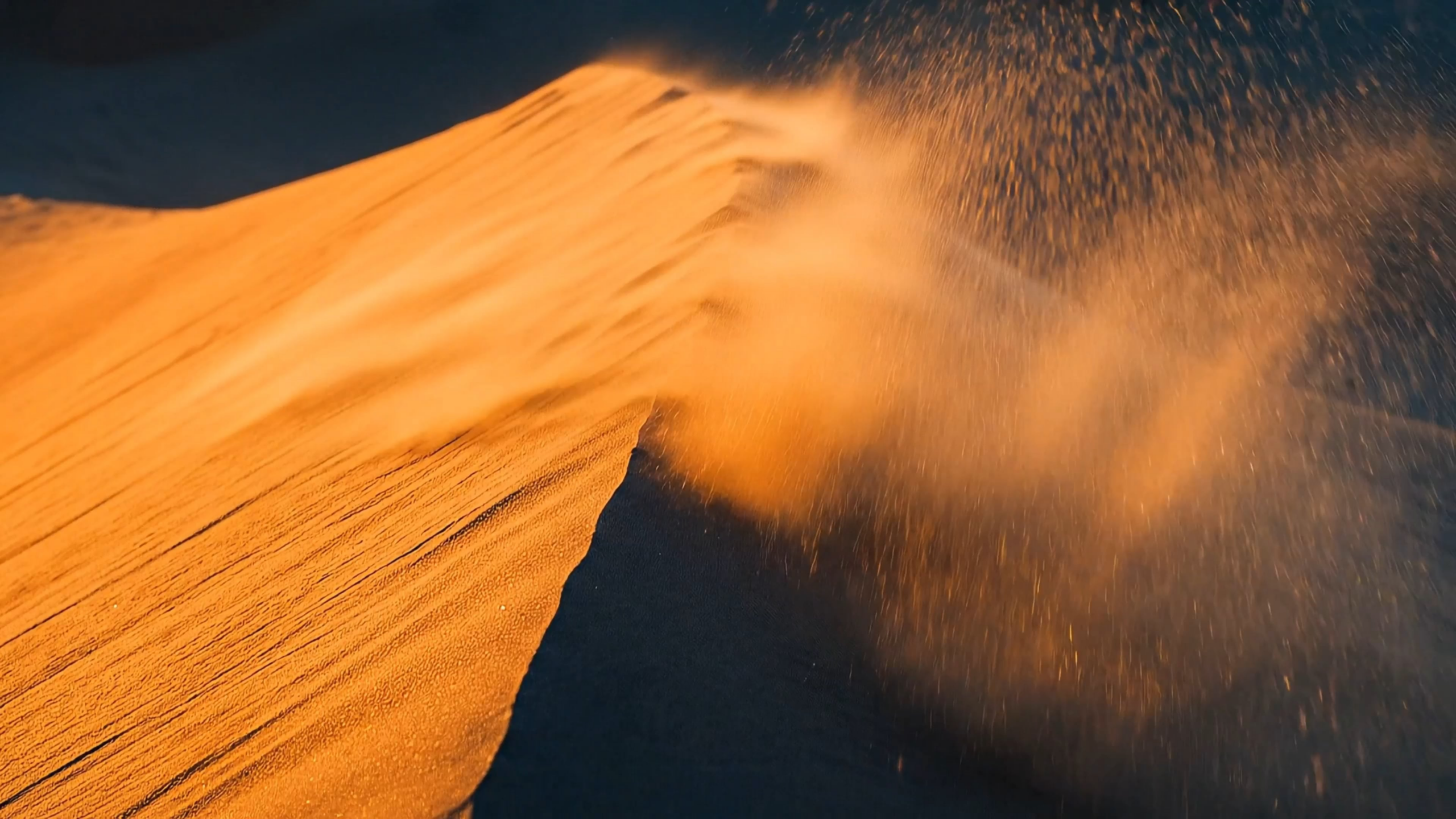 A cinematic close-up of a razor-sharp sand dune ridge in the Sahara desert. Golden hour lighting creates a harsh split between bright orange sand and deep shadowed blue sand. Fine grains of sand are being whipped off the crest by the wind, backlit by the sun. Photorealistic, 8k resolution, highly detailed texture, National Geographic style.
