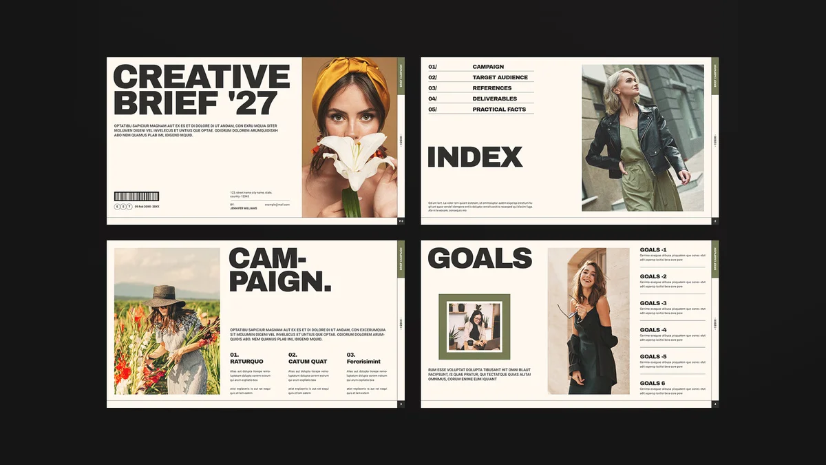 Each section employs a clean, modern aesthetic, balancing strong typography, organized layouts, and designated image placeholders. This thoughtful structure ensures you cover every crucial aspect of your creative brief in a logical, compelling flow.