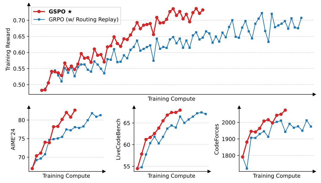 - On benchmarks such as AIME’24, LiveCodeBench, and CodeForces, GSPO achieves better reward curves than GRPO.