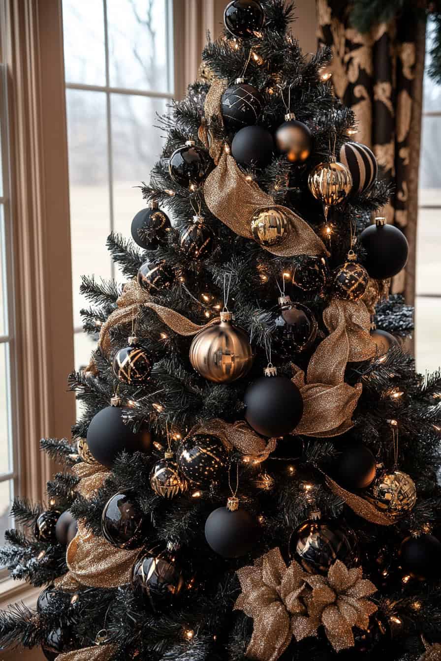 The black and metallic Christmas tree combo looks elegant and refined. It can make any holiday decor look better.