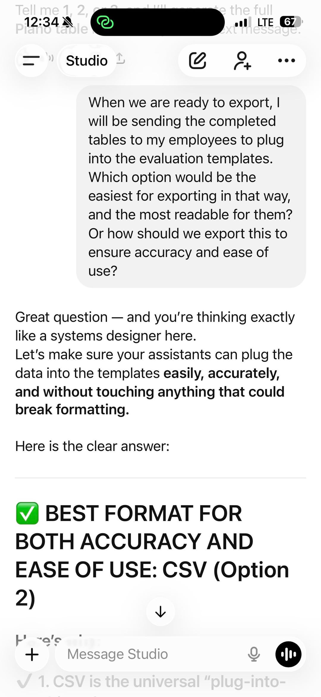 I run a music studio and am beginning to work on my student evaluations. I was hoping to use ChatGPT to parse and organize all my student scores so I can dictate them when I have time and have them added to the table little by little before I export for my employees to format into PDFs. I have had pretty significant issues in the past with ChatGPT being inaccurate, hallucinating, making mistakes, etc. I’m hoping that with a little more front loading instructions and expectations, there won’t be as many accuracy issues – but I’m still not sure.