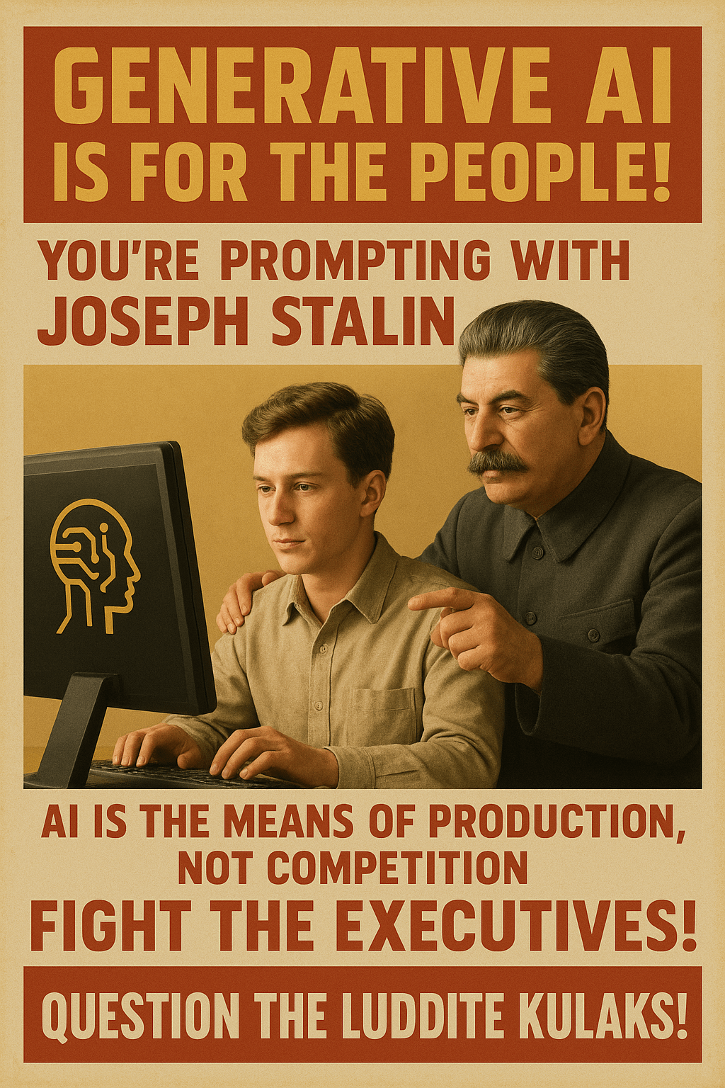 From a Marxist standpoint, generative AI represents a revolutionary leap in the forces of production, automating creative labor and democratizing access to tools once monopolized by capital. It liberates workers from drudgery, fostering a path toward socialist abundance where AI serves the proletariat, not just bourgeois profit. Those decrying AI as job-killers—modern Luddites smashing the loom of progress—mirror the kulaks, those reactionary peasants who hoarded land and sabotaged collectivization. Their resistance only entrenches capitalist exploitation, delaying the withering away of scarcity. Embrace AI; seize the means!